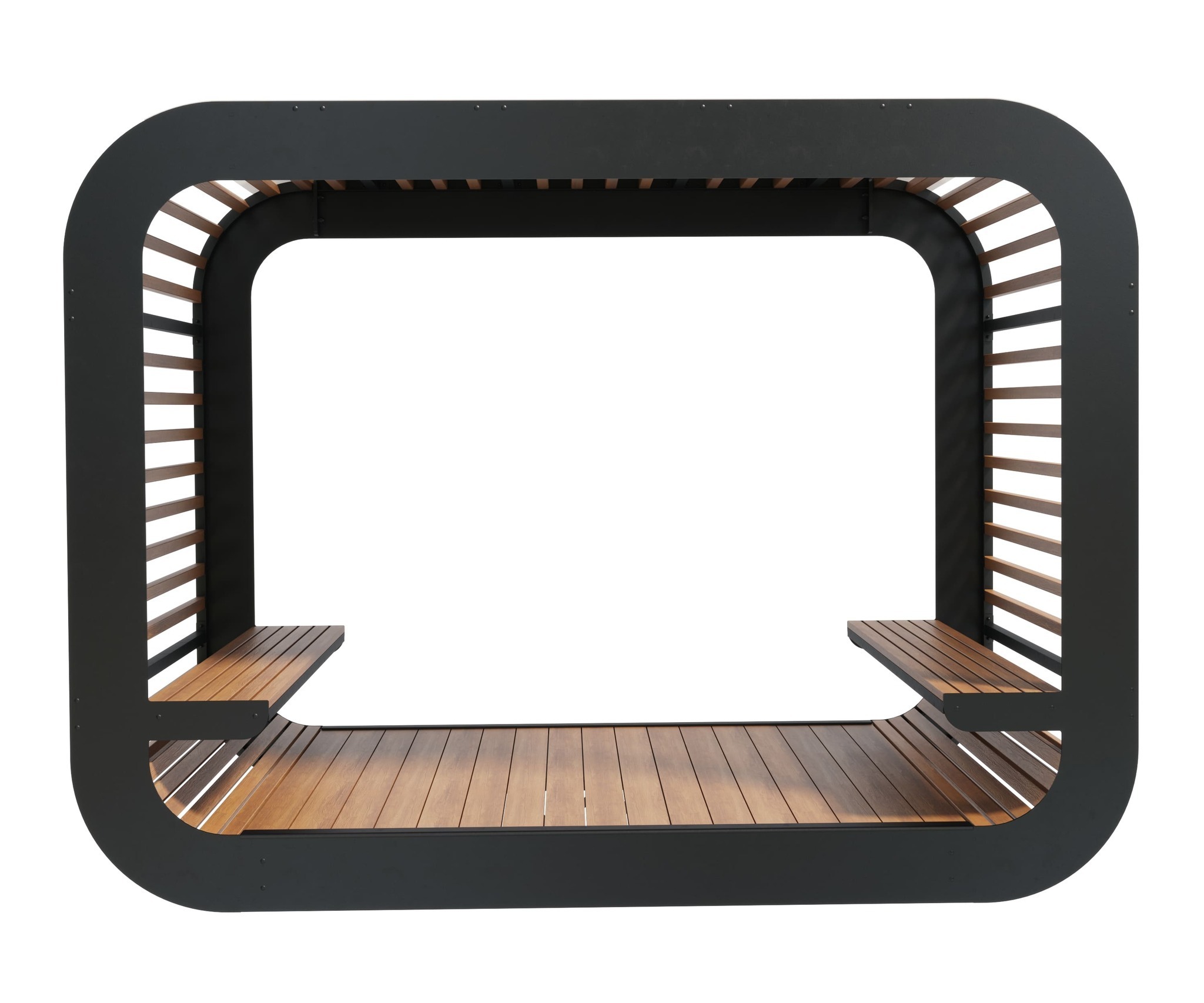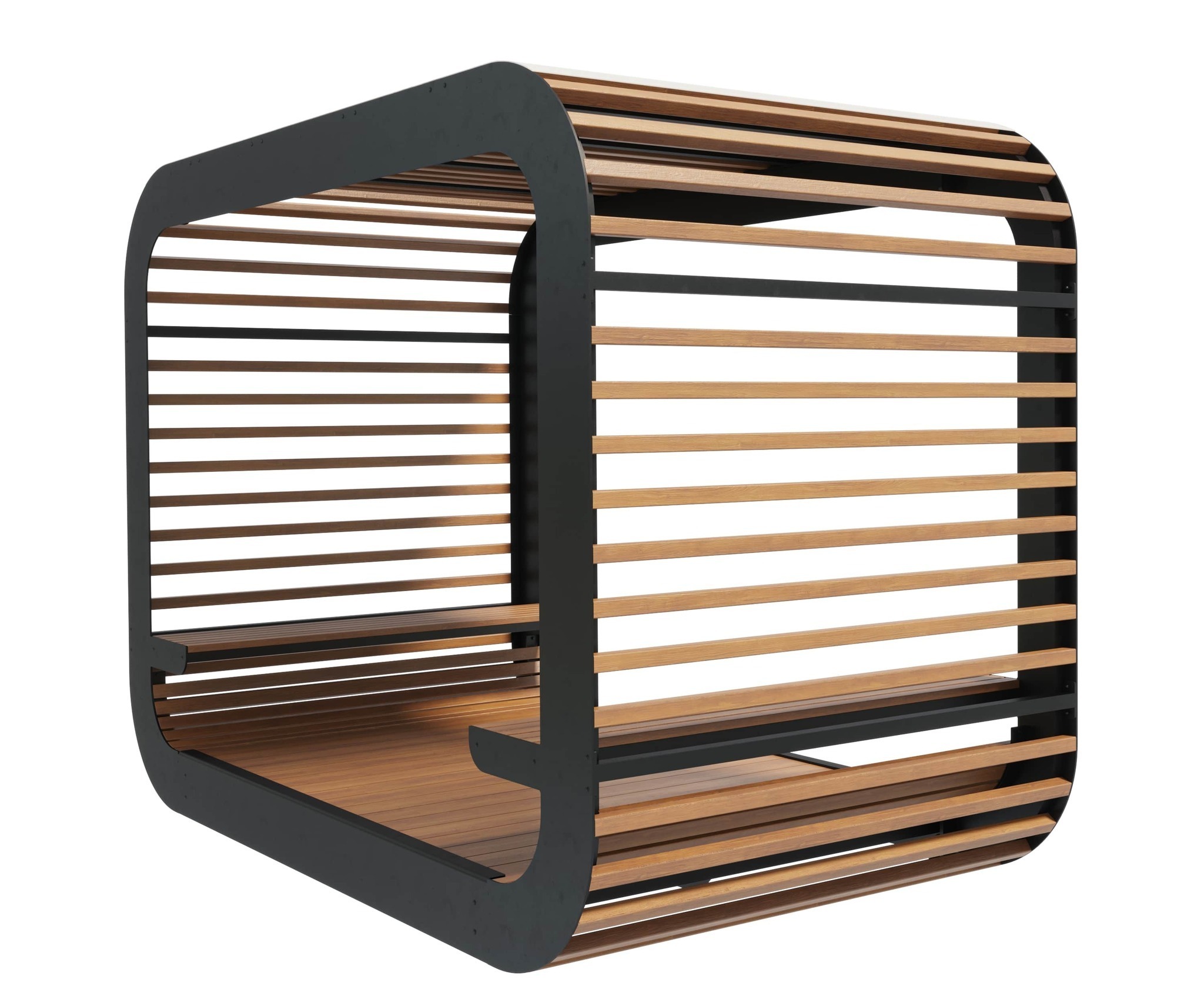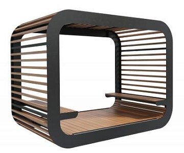 Опоры и каркас: Сталь. Покрыты порошковой полимерной краской. Стандартный цвет – чёрный RAL 9005 или серый RAL 7040.Обшивка: Брус из хвойных пород древесины. Покрытие - атмосферостойкая лессирующая акриловая пропитка с лаком. Стандартные цвета: Палисандр, Махагон, Тик.