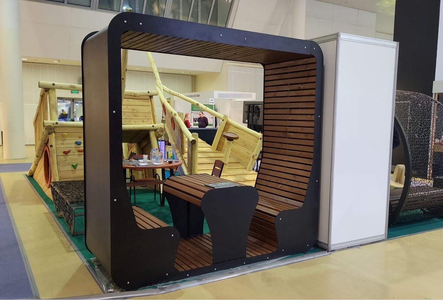 Опоры и каркас: Сталь. Покрыты порошковой полимерной краской. Стандартный цвет – чёрный RAL 9005 или серый RAL 7040.Обшивка: Брус из хвойных пород древесины. Покрытие - атмосферостойкая лессирующая акриловая пропитка с лаком. Стандартные цвета: Палисандр, Махагон, Тик.