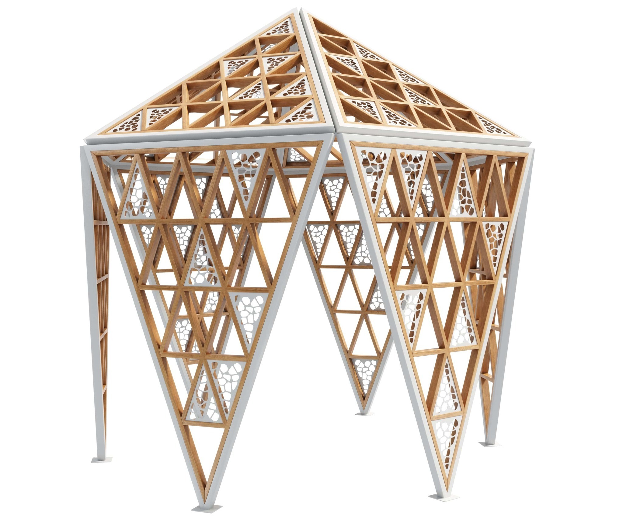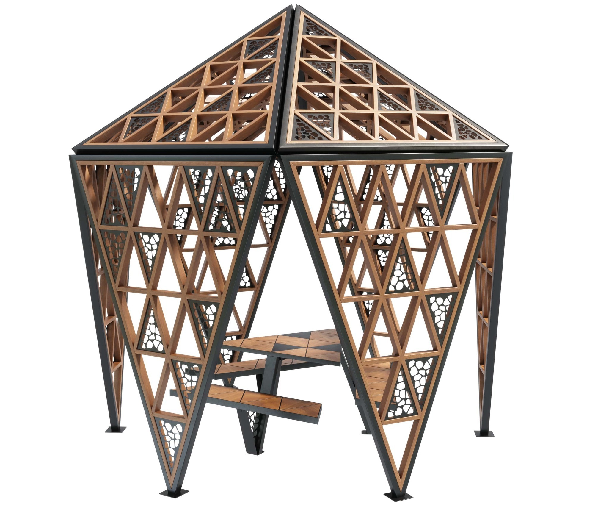 Каркас: Сталь. Покрыт порошковой полимерной краской. Стандартный цвет – чёрный RAL 9005 или серый RAL 7040.Обшивка: Брус из хвойных пород древесины. Покрытие - атмосферостойкая лессирующая акриловая пропитка с лаком. Стандартные цвета: Палисандр, Махагон, Тик.