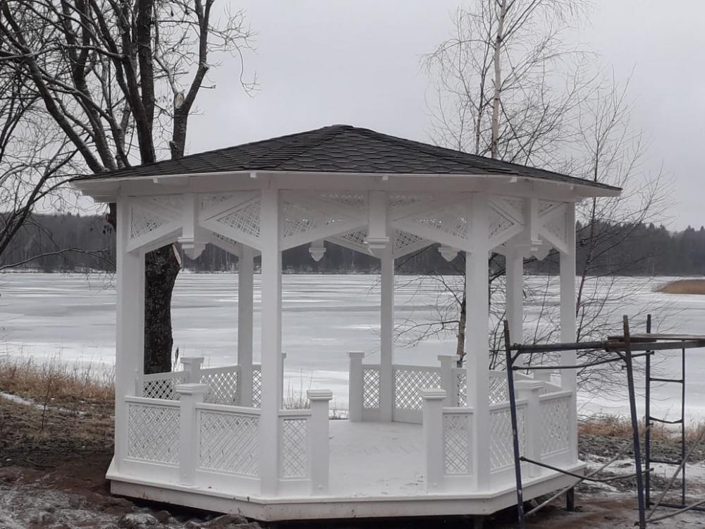 Деревянные элементы: Сосна. Покрытие - атмосферостойкая лессирующая акриловая пропитка с лаком.Металлические элементы: Порошковая покраска в цвет беседки.
