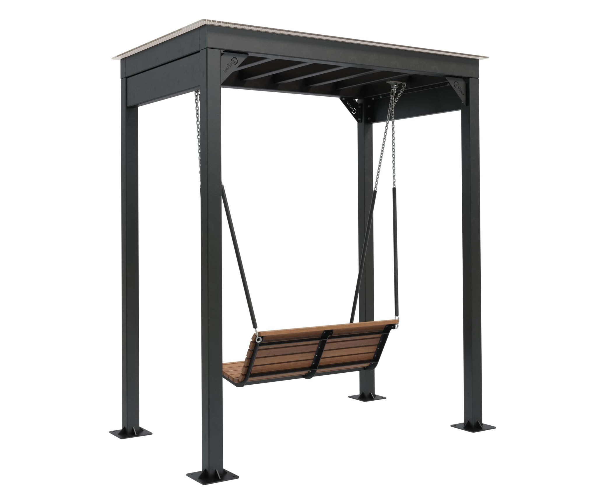 Каркас: Сталь. Покрыт порошковой полимерной краской. Стандартный цвет – чёрный RAL 9005 или серый RAL 7040.Сиденье и спинка: Брус из хвойных пород древесины. Покрытие - атмосферостойкая лессирующая акриловая пропитка с лаком. Стандартные цвета: Палисандр, Махагон, Тик.