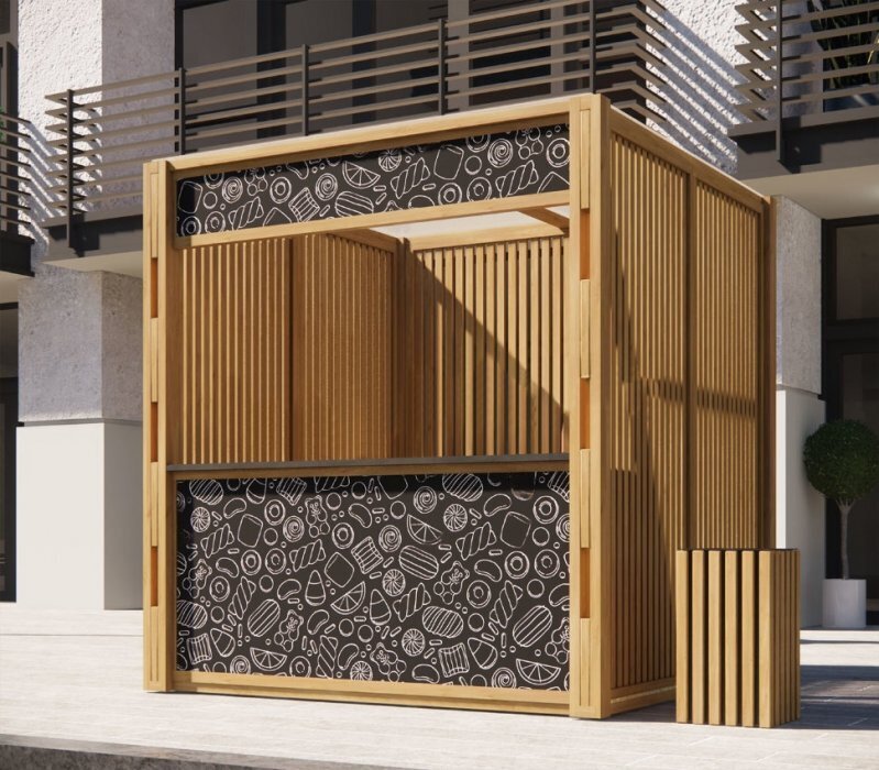 Бовер- это модульная, реечная конструкция, современный торговый павильон из дерева, легко адаптируется к разным форматам и видам торговли. Простой и лаконичный дизайн органично вписывается в любую концепцию мероприятия. Он одинаково стильно смотрится на улицах города и в торговых центрах. Может использоваться, как кофейный ларёк, киоск с сувенирами или мороженым. Так же, может применяться для ярмарочной торговли и фестивальной застройки. На этой конструкции отлично смотрится печать на обшивке. Выглядит эффектно, придаёт торговому павильону индивидуальный стиль и дизайн. Размер: 2х2 м. ВЫСОТА 2,2 м. Что входит в стоимость торгового павильона «БОВЕР» Б-11 КОНСТРУКТИВ: - Плитка / блоки на выбор - Cтойки деревянные, сдвоенные декоративные (4 шт.) - Лаговая система (обвязка, лаги) - Стропильная система (обвязка, стропила) - Пол ОСП не менее 12 мм - Стенки реечные, боковые (2 шт.) Рама 45 х 45 мм, рейка декоративная 40 х 22 мм, просвет 20 мм. - Стенка реечная, задняя (1 шт.) Рама 45 х 45 мм, рейка декоративная 40 х 22 мм, просвет 20 мм. - Дверь реечная в комплекте с замком, ручкой, крепёжными элементами - Стол-прилавок. 1800 х 600 мм. Материал: фанера ОСП-2, опоры - брус 45 х 45 мм., крепёжные элементы - Передняя стенка меловая. Высота 900 мм. Материал: обшивка фанера ФСФ + меловое окрашивание., крепёжные элементы КРОВЛЯ: - Кровля поликарбонат сотовый, толщина не менее 8 мм. - Комплект расходных кровельных материалов ОБРАБОТКА, ОКРАШИВАНИЕ: - Антисептирование лаговой системы - Обработка огнебиозащитным составом всех элементов конструкции (с выдачей сертификата) ДЕКОР: - Фриз шириной 300 мм с лицевой стороны конструкции, покрытие меловая краска (1 шт.) Характеристики: Производитель Россия Артикул Н138588 Высота 220 см Ширина 200 см Глубина 200 см Материал деревянные Размещение на улице