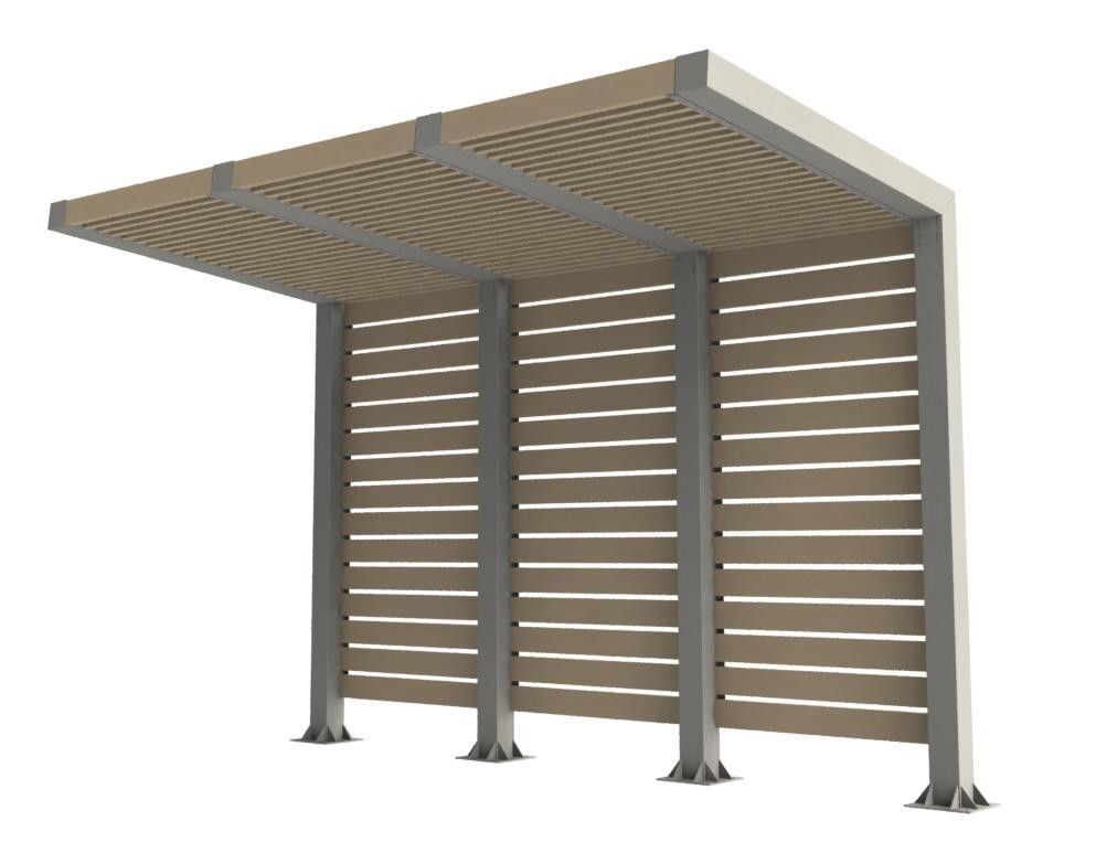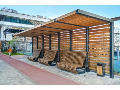 Опоры и каркас: Сталь. Покрыты порошковой полимерной краской. Стандартный цвет – чёрный RAL 9005 или серый RAL 7040.Обшивка: Брус из хвойных пород древесины. Покрытие - атмосферостойкая лессирующая акриловая пропитка с лаком. Стандартные цвета: Палисандр, Махагон, Тик.