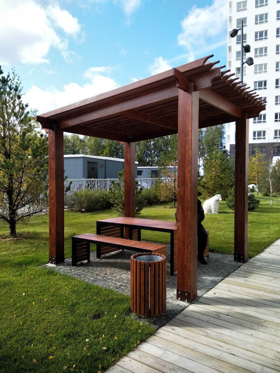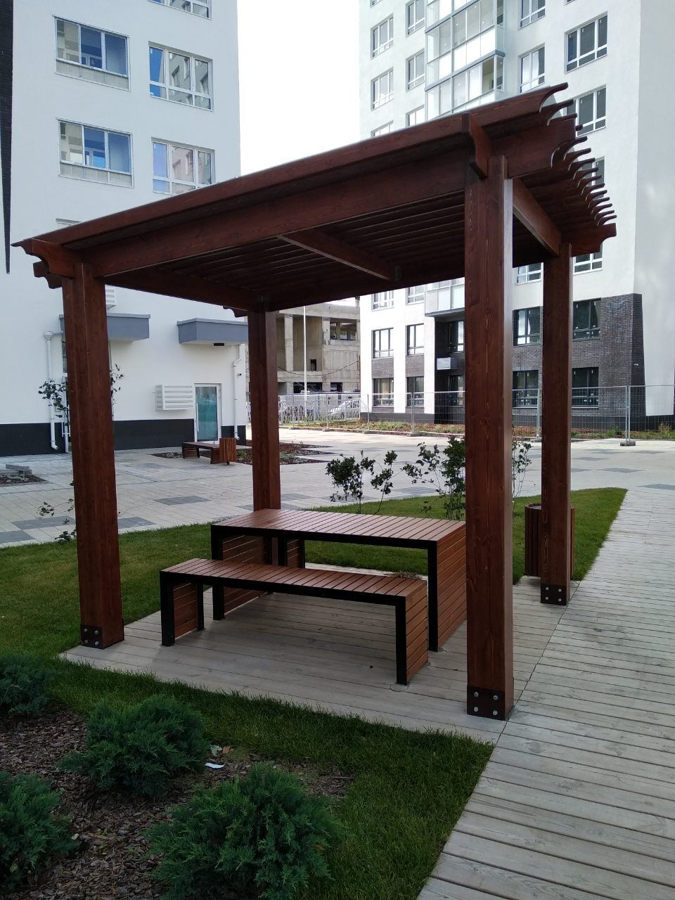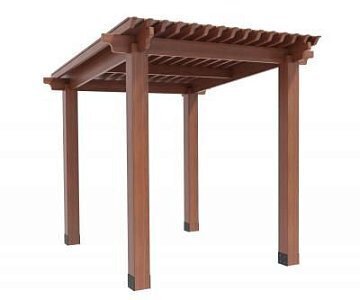 Опоры и каркас: Брус из хвойных пород древесины. Покрытие - атмосферостойкая лессирующая акриловая пропитка с лаком. Стандартные цвета: Палисандр, Махагон, Тик.Крыша: Поликарбонат