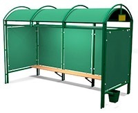 Павильон ГАм – вместительная и надежная конструкция, предназначенная для длительной эксплуатации даже в самых сложных условиях. Усиленная рама с поперечинами, обшивка стен и крыши металлическим листом – все это позволяет эксплуатировать модель в городах с суровым климатом. Изделие хорошо защищает от погодных факторов большое количество пассажиров. В комплектации, кроме лавочки и урны, предусмотрены доска для объявлений и рамка для расписания.