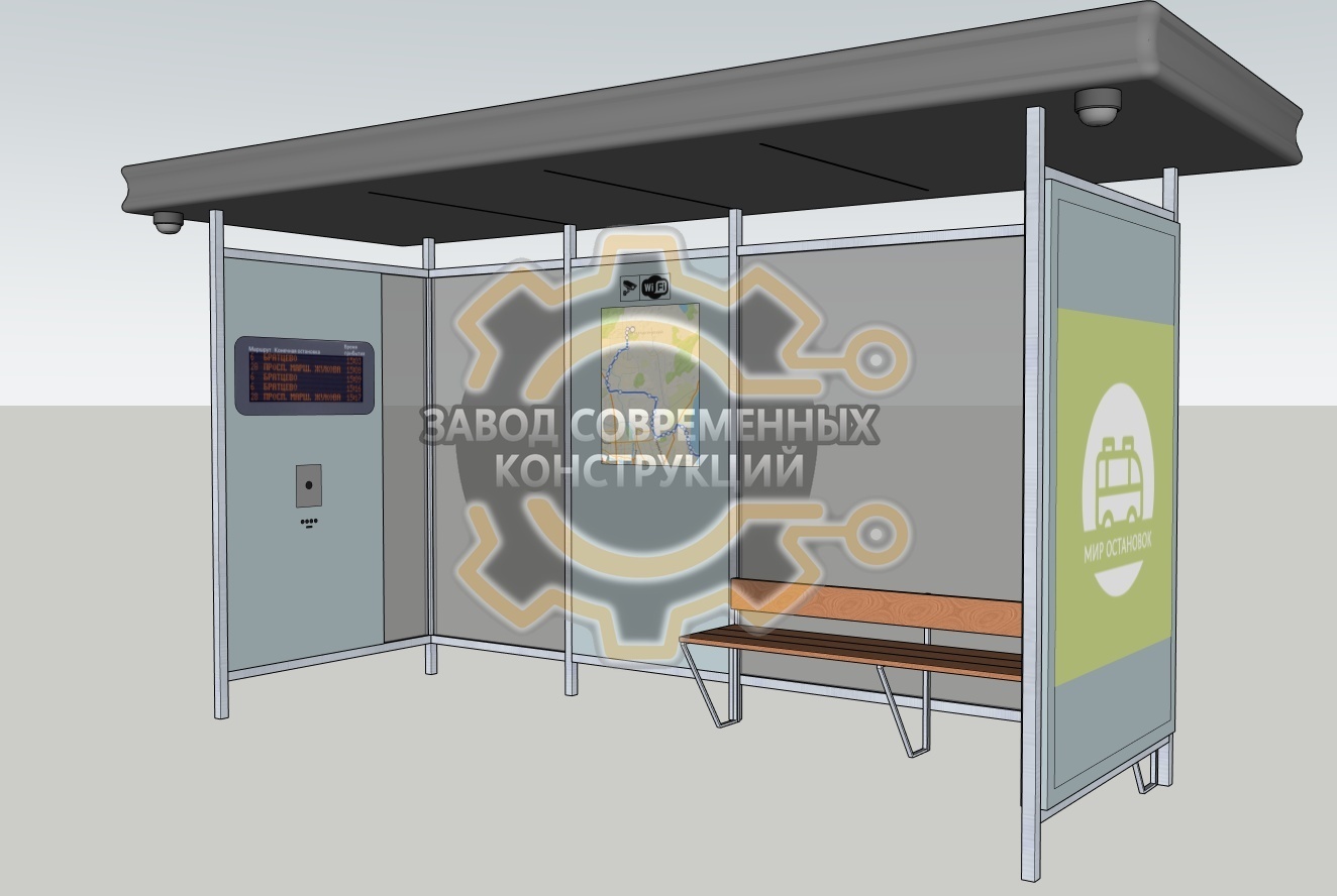 Умная интерактивная остановка с современным дизайном, оборудованная дополнительными функциями для комфортного ожидания общественного транспорта.