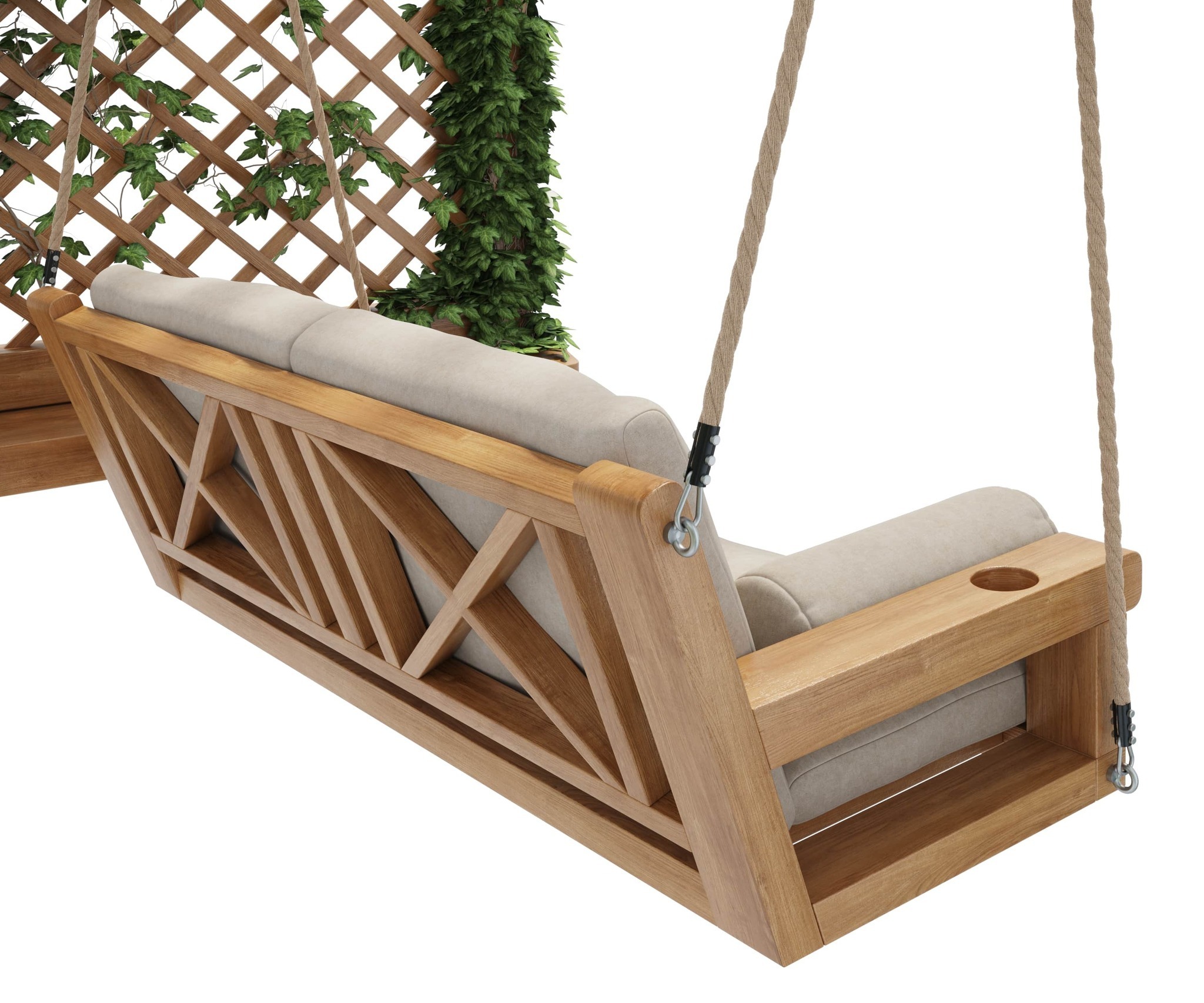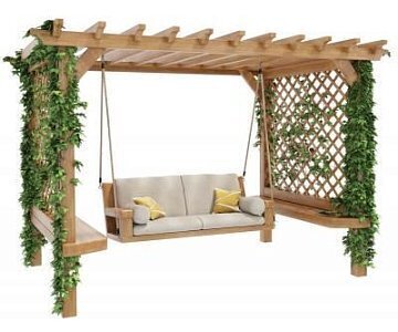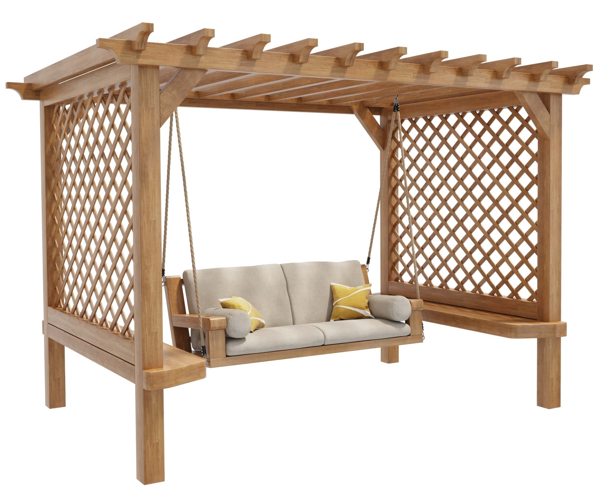 Пергола, сиденье и спинка скамейки: Брус из хвойных пород древесины. Покрытие - атмосферостойкая лессирующая акриловая пропитка с лаком. Стандартные цвета: Палисандр, Махагон, Тик.Сиденье и спинка: Матрас и подушки.
