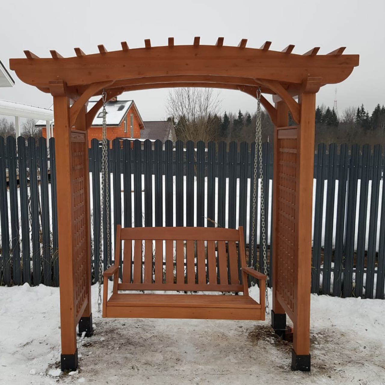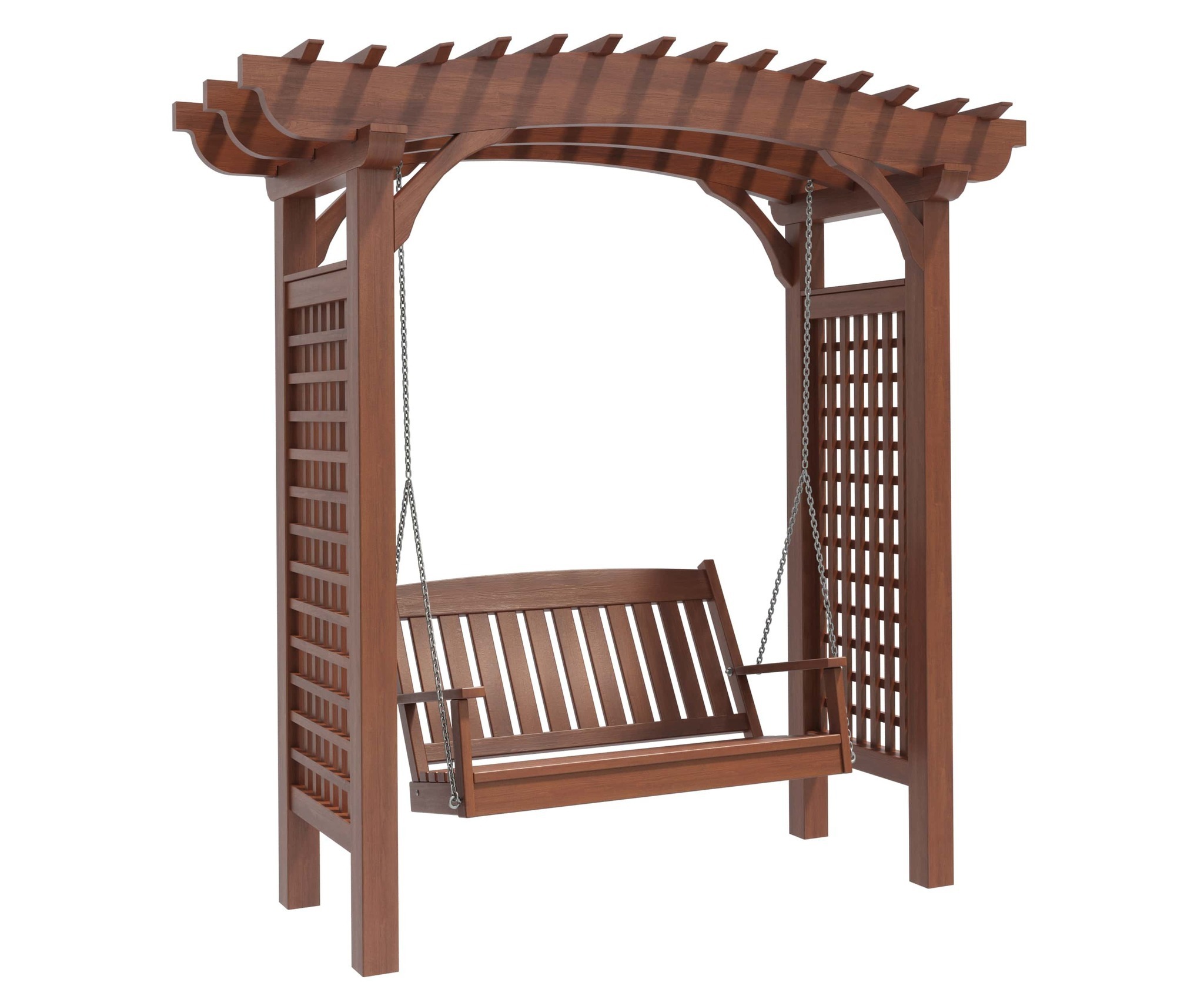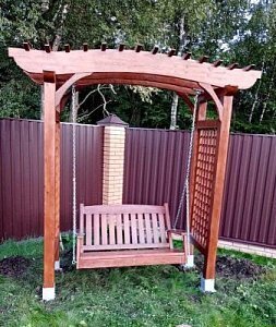 Опоры и каркас: Брус из хвойных пород древесины. Покрытие - атмосферостойкая лессирующая акриловая пропитка с лаком. Стандартные цвета: Палисандр, Махагон, Тик.Цепь: Оцинкованная. По умолчанию - в термоусадочной плёнке.