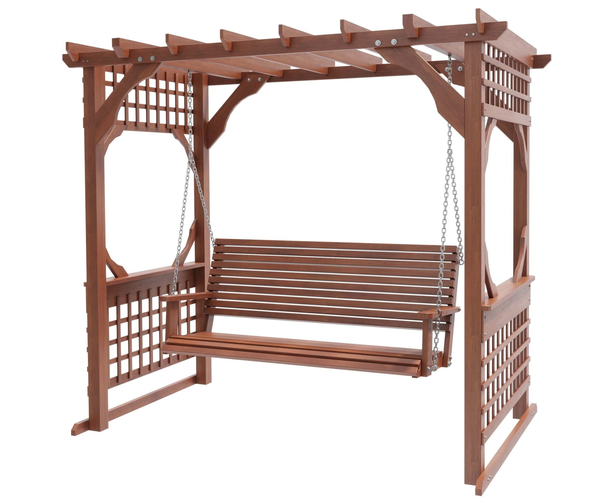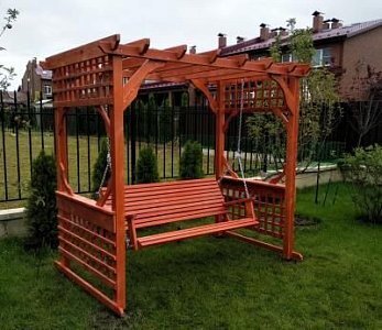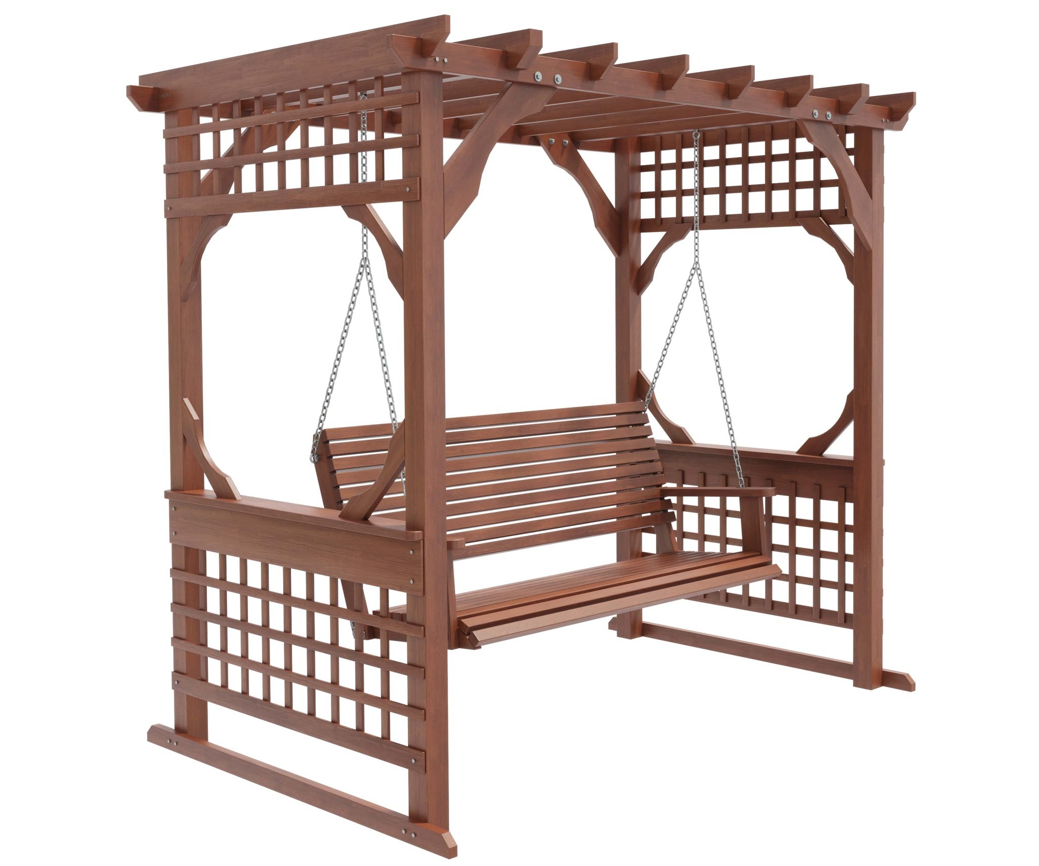 Опоры и каркас: Брус из хвойных пород древесины. Покрытие - атмосферостойкая лессирующая акриловая пропитка с лаком. Стандартные цвета: Палисандр, Махагон, Тик. Также предусмотрена возможность покрытия бруса маслом для наружных работ.Цепь: Оцинкованная. По умолчанию - в термоусадочной плёнке.