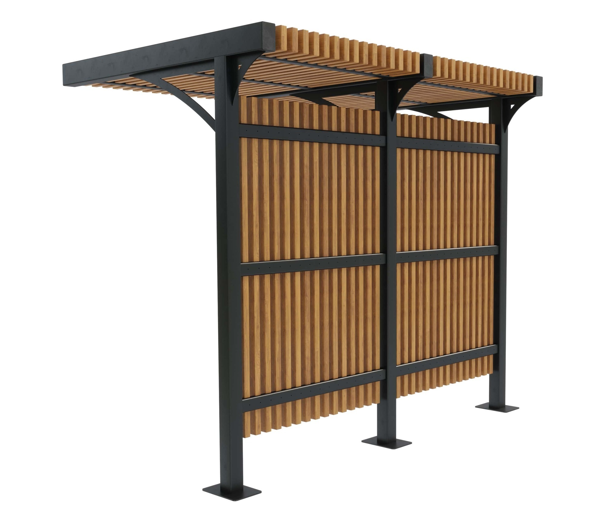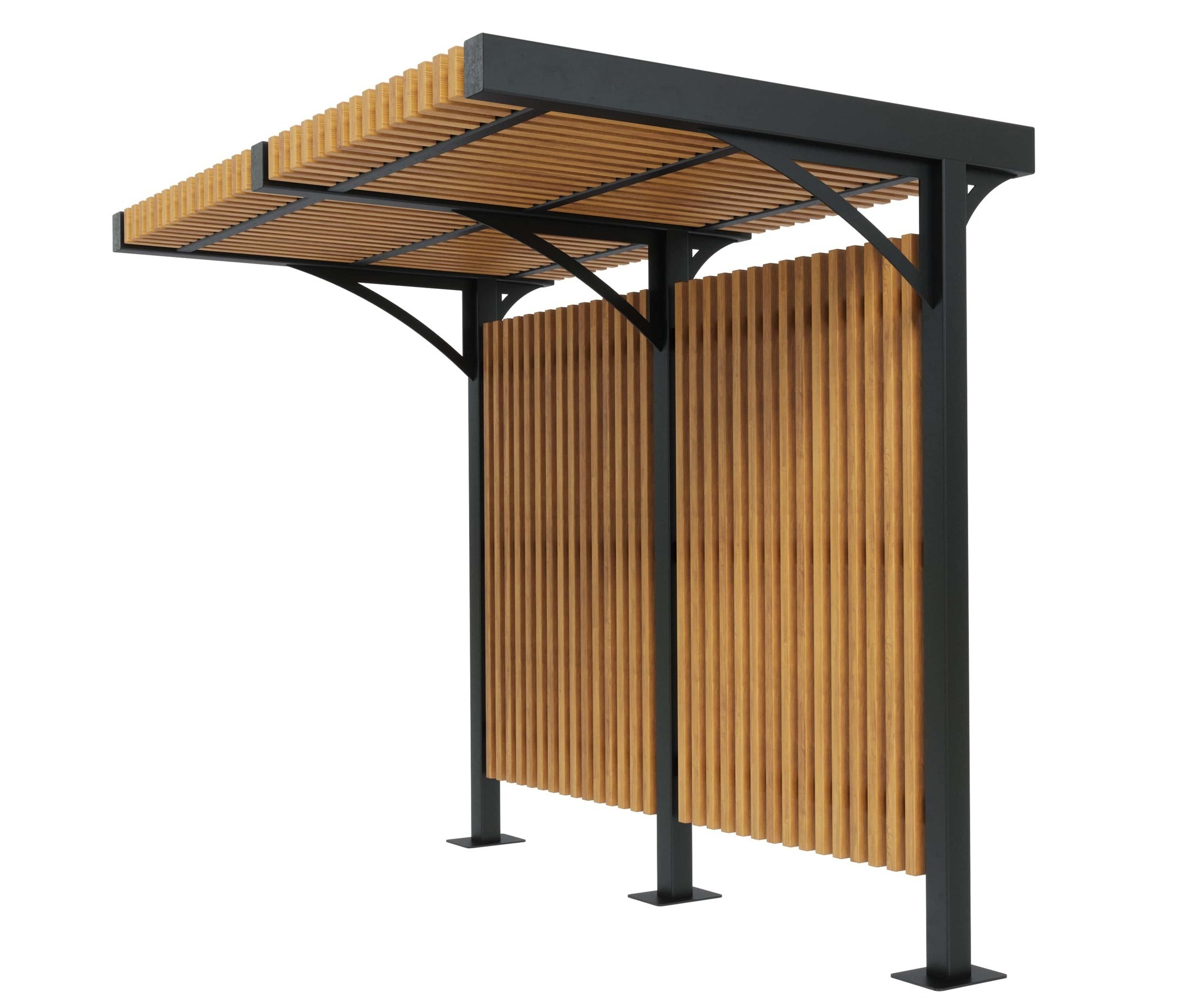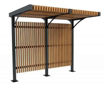 Опоры и каркас: Сталь. Покрыты порошковой полимерной краской. Стандартный цвет – чёрный RAL 9005 или серый RAL 7040.Обшивка: Брус из хвойных пород древесины. Покрытие - атмосферостойкая лессирующая акриловая пропитка с лаком. Стандартные цвета: Палисандр, Махагон, Тик.