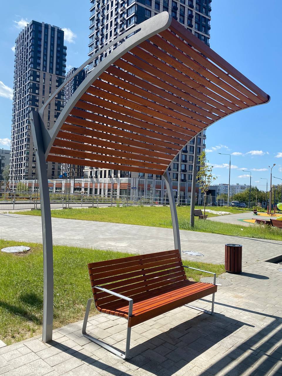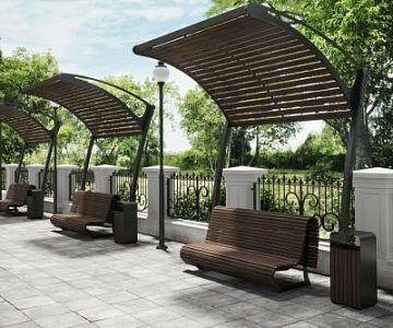 Опоры: Сталь. Покрыты порошковой полимерной краской. Стандартный цвет – чёрный RAL 9005 или серый RAL 7040.Крыша: Брус из хвойных пород древесины. Покрытие - атмосферостойкая лессирующая акриловая пропитка с лаком. Стандартные цвета: Палисандр, Махагон, Тик.
