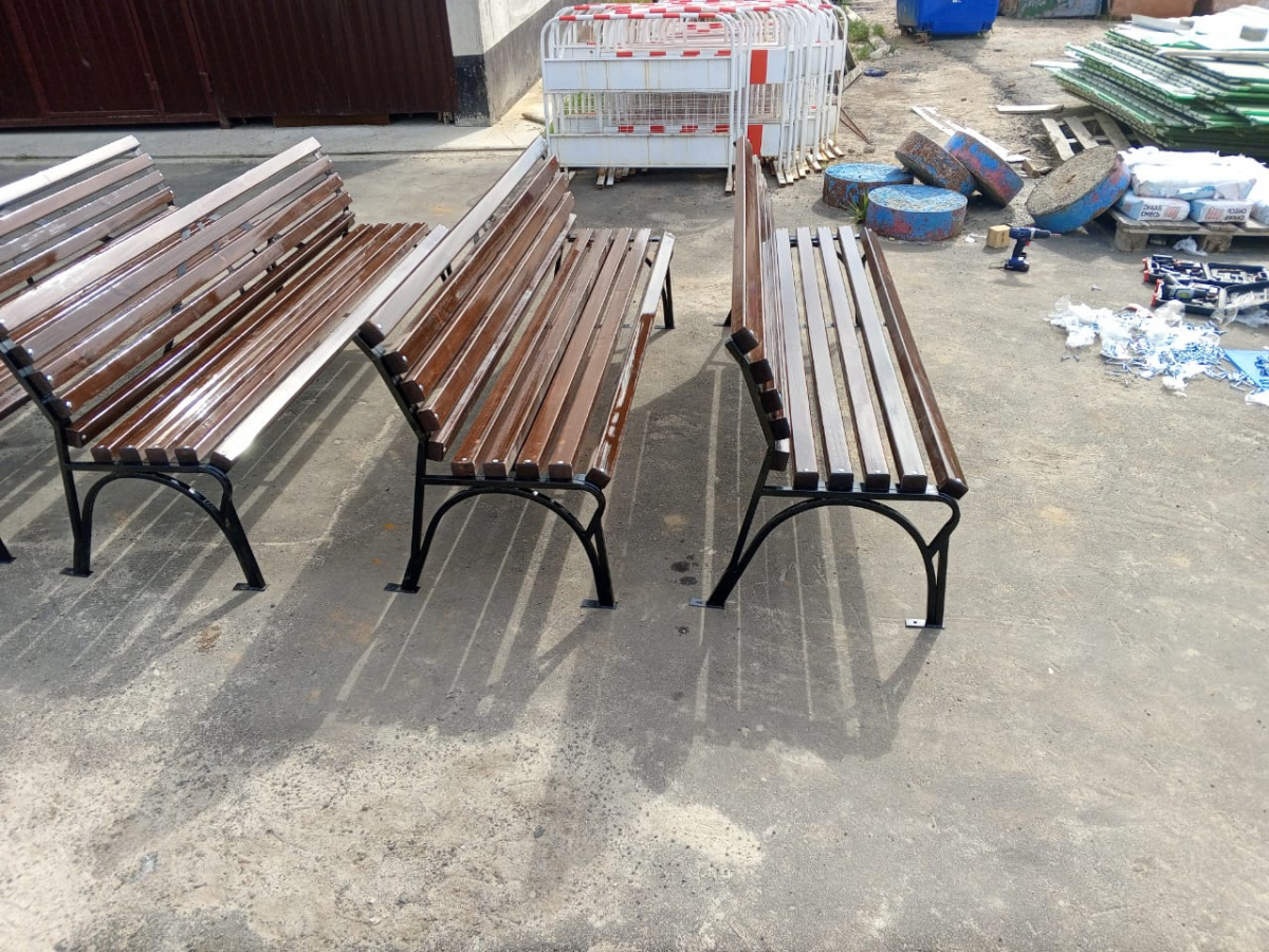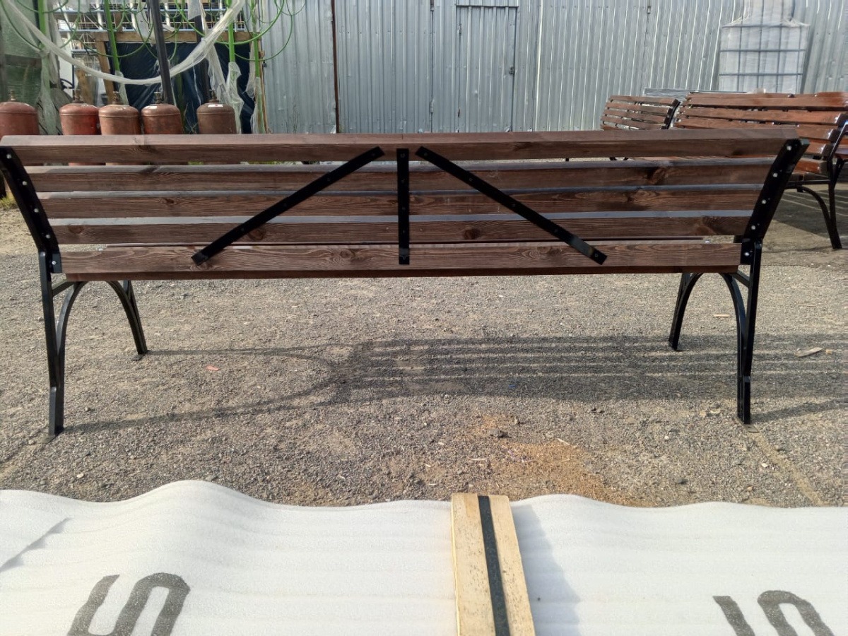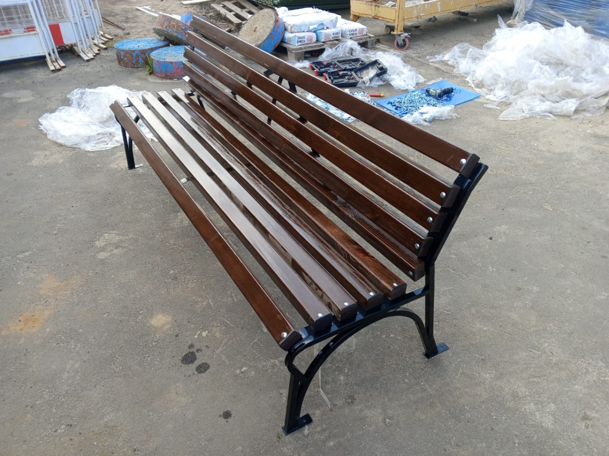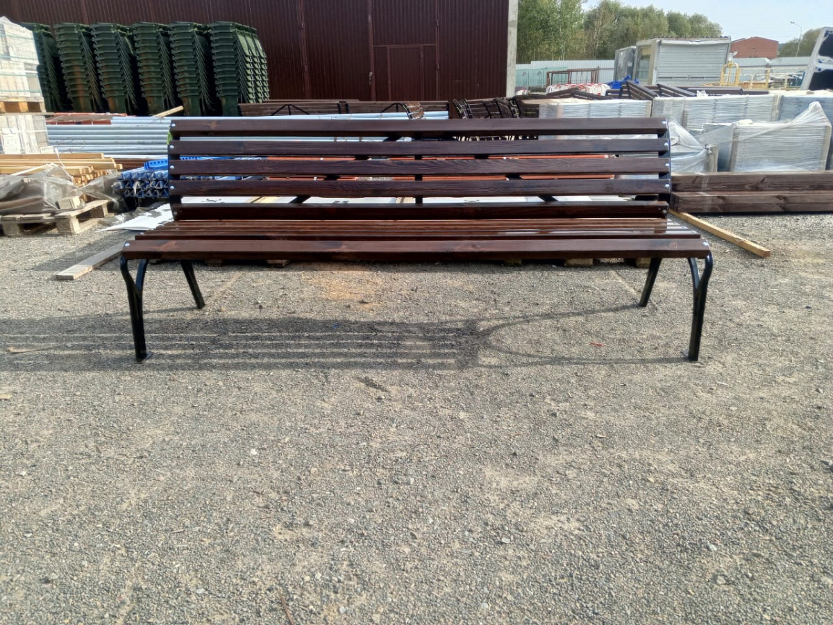 Общая длина скамейки: 1,5 м. Высота в верхней точке: 820 мм. Высота сиденья от пола: 430 мм. Ширина сидения: 420 мм Высота спинки: 420 мм. Окрас каркаса: Порошковая полиэфирная краска RAL 9005. Материал исполнения каркаса: Квадрат труба 20х20 (1,5мм) Брус: кол-во 10 шт. Сечение бруса: 60х40. Материал пропитки: Антисептик (цвет-палисандр) и 3 слоя лака. Комплект: