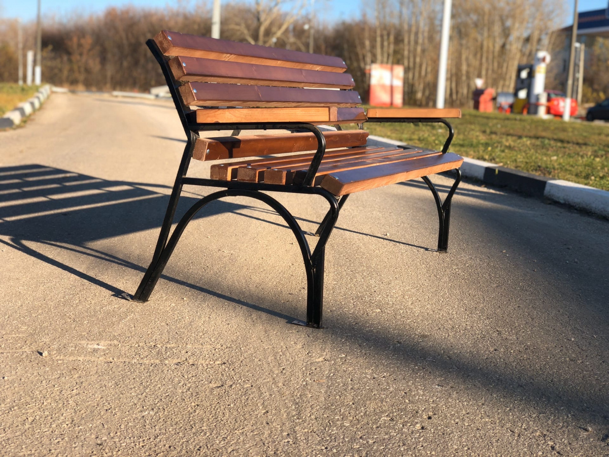 Общая длина скамейки: 1,5 м. Высота сидения: 430 мм Высота в верхней точке: 820 мм. Высота сиденья от пола: 440 мм. Ширина сидения: 430 мм Ширина спинки: 420 мм. Окрас каркаса: Порошковая полиэфирная краска RAL 9005. Материал исполнения каркаса: Квадрат труба 20х20 (1,5мм) Брус: кол-во 10 шт. Сечение бруса: 60х40. Материал пропитки: Антисептик (цвет-палисандр) и 3 слоя лака. Комплект:
