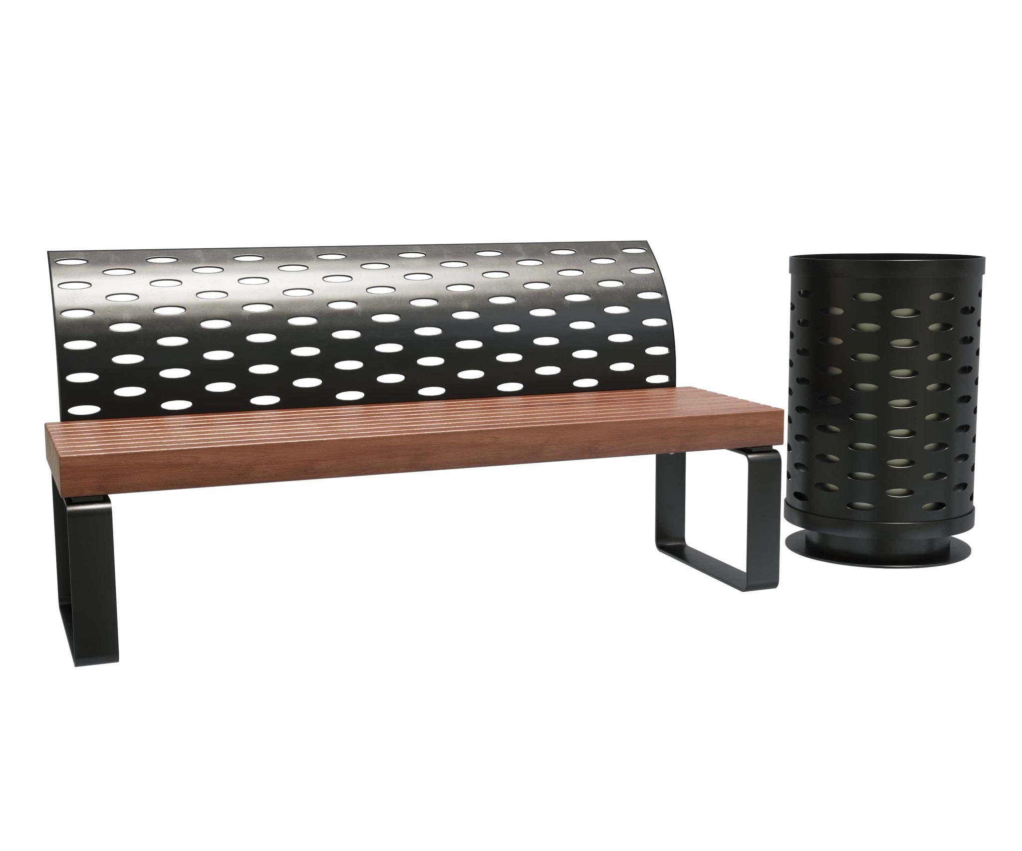 Опоры и спинка: Сталь. Покрыты порошковой полимерной краской. Стандартный цвет – чёрный RAL 9005 или серый RAL 7016.Сиденье: Брус из хвойных пород древесины. Покрытие - атмосферостойкая лессирующая акриловая пропитка с лаком. Стандартные цвета: Палисандр, Махагон, Тик.