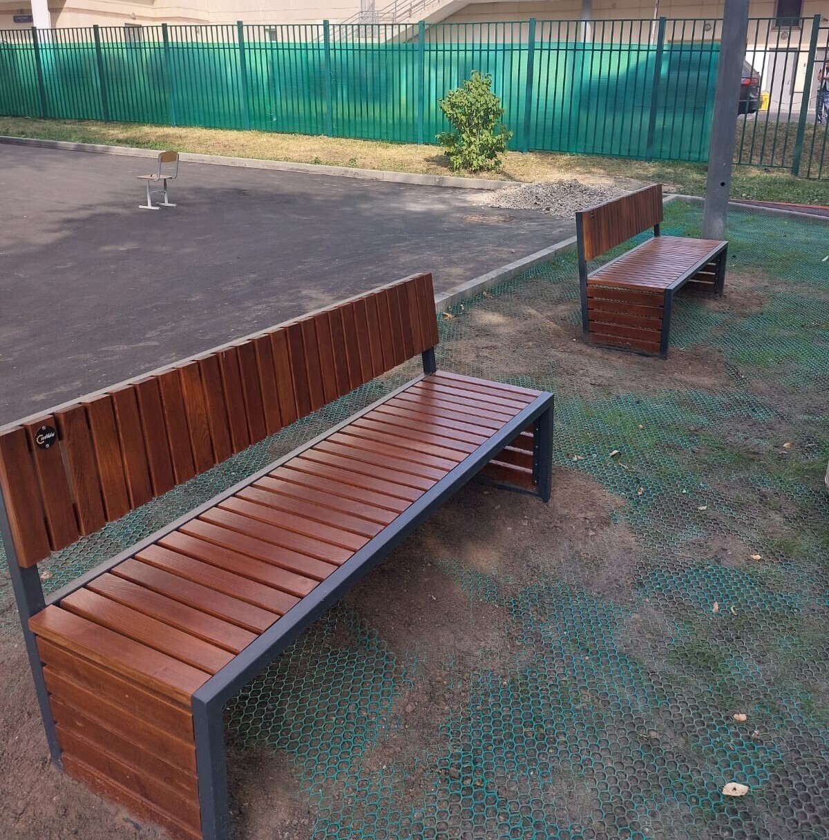 Сиденье и спинка: Брус из хвойных пород древесины. Покрытие - атмосферостойкая лессирующая акриловая пропитка с лаком. Стандартные цвета: Палисандр, Махагон, Тик.