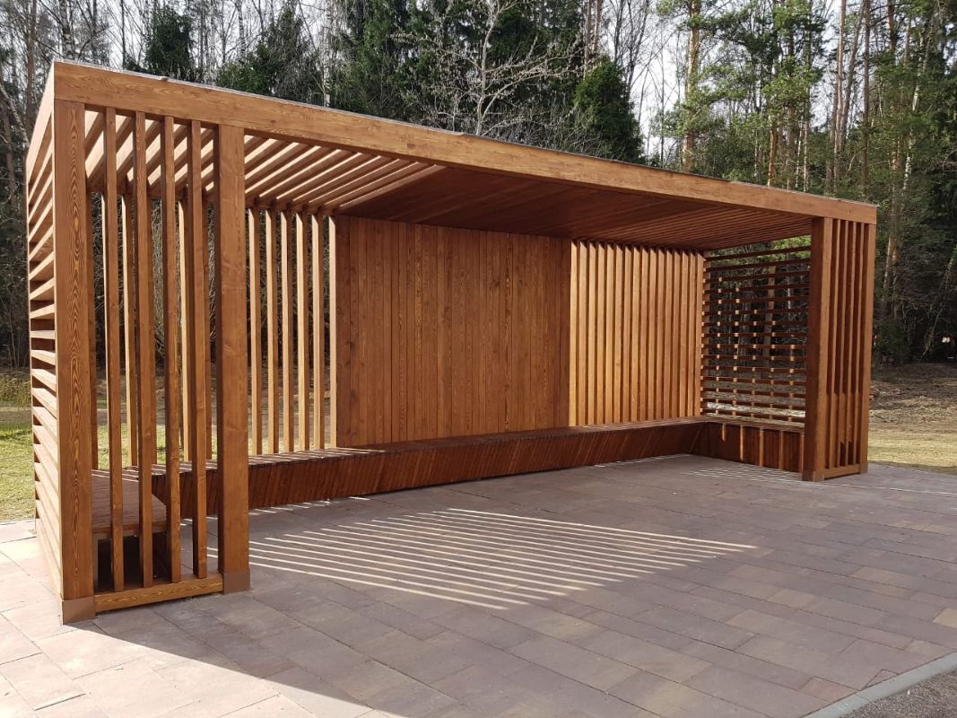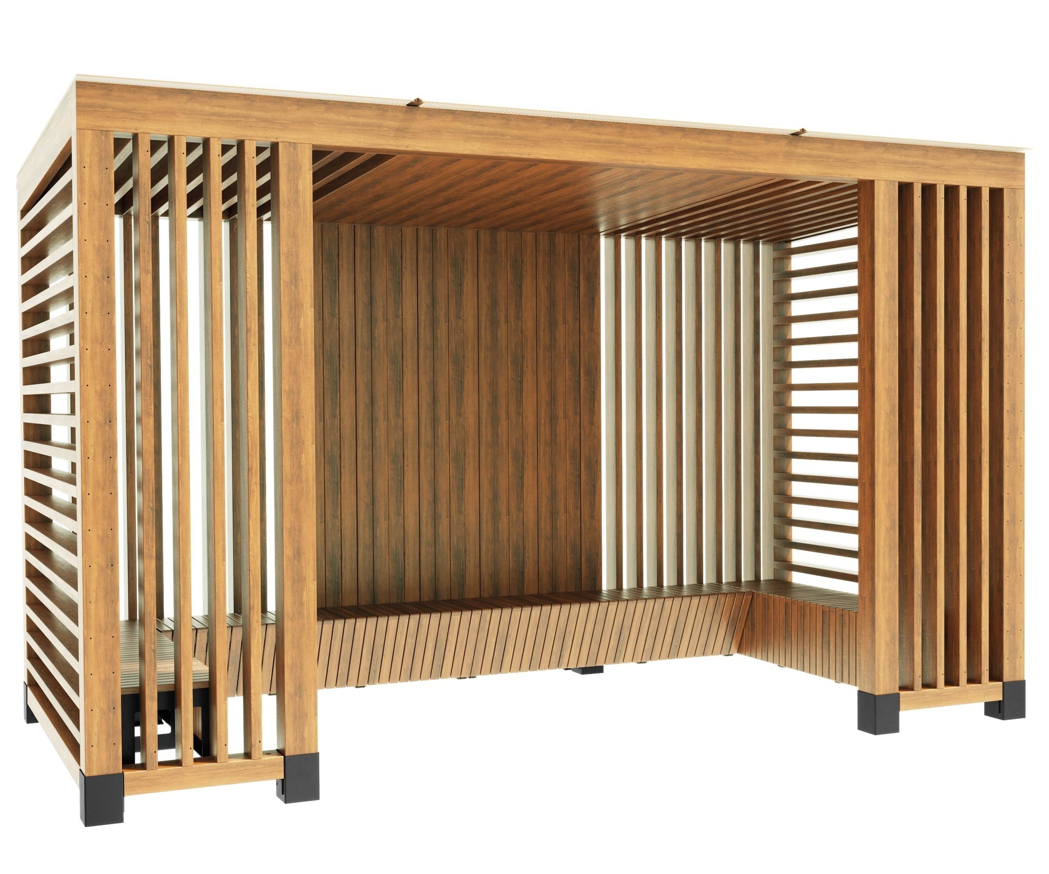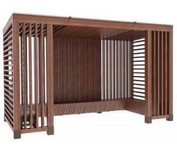 Опоры и каркас: Сталь. Покрыты порошковой полимерной краской. Стандартный цвет – чёрный RAL 9005 или серый RAL 7040.Обшивка и скамейка: Брус из хвойных пород древесины. Покрытие - атмосферостойкая лессирующая акриловая пропитка с лаком. Стандартные цвета: Палисандр, Махагон, Тик.